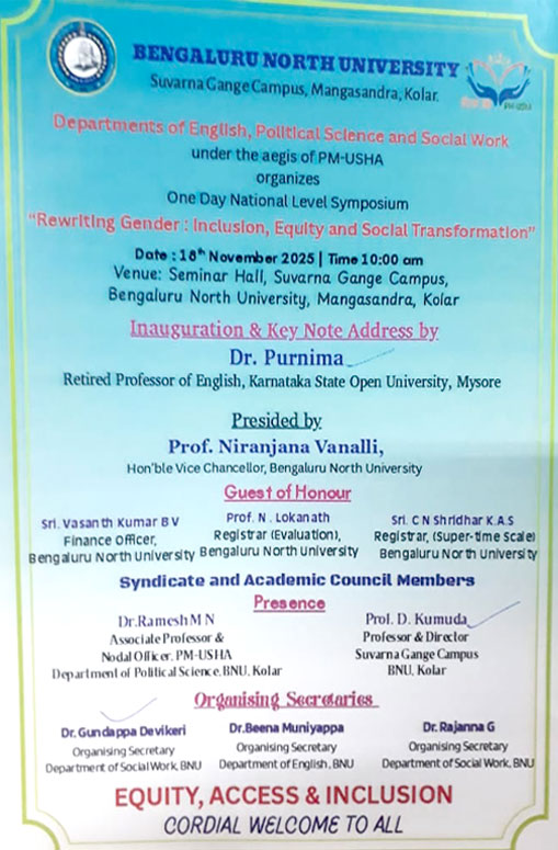 - In connection with Bengaluru North University’s One Day National Level Symposium, Dr. R. Purnima, delivered a Key Note Address on “Rewriting Gender: Inclusion, Equity, and Social Transformation” on 18th November, 2025, at Suvarna Gange Campus, Mangasandra, Kolar..