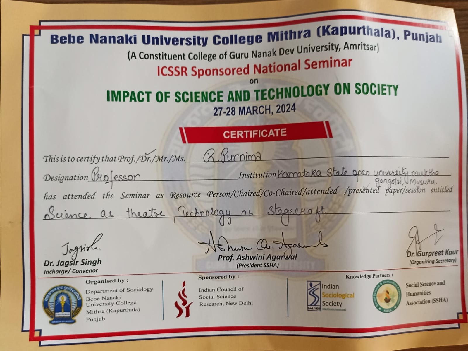 - A Two-Day National Seminar on “Prisma of Psychology in the Literary Realm”, organized by Department of Studies and Research in English, KSOU in collaboration with Department of Studies and Research in Psychology, KSOU, on 29th-30th November,2024, presented a Paper titled, Staging “Stage Chemistry: Neuro-Psychiatric Disorders on Stage”: Not just a Journey, but a Pilgrimage”